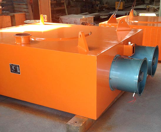 風冷電磁除鐵器,采用空調(diào)或軸流風機強迫風冷,增加風道,增大線路與空氣的接觸面積,改善風冷效果。大型除鐵器采用軸流風機,風壓高,風量大,風冷效果強。控制柜采用聯(lián)鎖機構(gòu),即風機一停,除鐵器勵磁立即停電報警。
